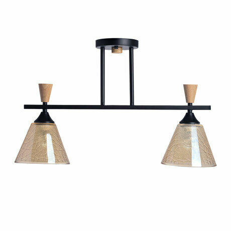 Металлическое основание потолочной люстры окрашено в черный цвет. Стеклянные плафоны отлиты в фактурную форму и гальванизированы в цвет коньяка. Потолочная люстра декорирована элементами из светлого натурального дерева.