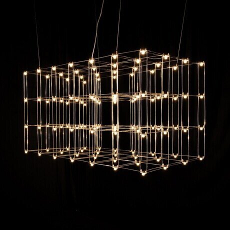 Люстра Cosmic ячейка 20 х 20 см 120*60*60 золото Дизайнерский подвесной светильник Cosmic ячейка 20x20 напоминает светящееся облако, парящее в пространстве без какой-то опоры. Множество мелких светящихся точек, расположенных в строгом порядке, при взгляде под разными углами складываются в эффектные геометрические фигуры. Футуристичная конструкция создается вручную из тонких прутков нержавеющей стали и светодиодов. Светильник Cosmos Square ячейка создает комфортный рассеянный свет и удачно смотрится в центре гостиной, над диваном или обеденным столом. Гармонично вписывается в стилистику хайт-тека, минимализма. Может дополнить лофт-интерьер.Цоколь:LEDЦветовая температура:3000КДиммирование:нетКоличество светодиодов:112Световой поток, lm:6720Мощность, вт:56Степень защиты:IP20Крепление:Потолочная площадка; Цанговый подвесДлина тросов:150 см
