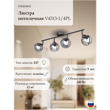 Люстра Vitaluce V4313-1/4PL, 4хE27х60Вт. Стиль - хай-тек. Материал плафона - стекло. Цвет арматуры - чёрный матовый. Площадь освещения - 12 кв.м. Вид цоколя - Е27. Мощность - 60Вт. Количество ламп - 4. Тип крепления - планка. Лампы в комплект не входят. Срок гарантии - 5 лет. Люстра выполнена в стиле хай-тек, но сможет вписаться и в разнообразные по стилю интерьеры: современный и классический стиль, лофт, гранж, готический, эклектика.