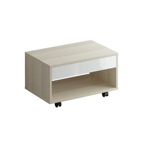 Стол журнальный с одним выдвижным ящиком и открытым отделением под ним. Ящик открывается за нижнюю кромку. Стол устанавливается на четыре колеса, что делает его мобильным и удобным в эксплуатации.