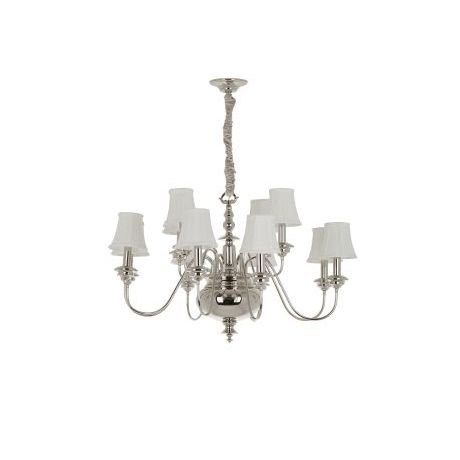 Металлическое основание цвета никель, тканевые абажуры белого цвета. Высота люстры 98 см. Диаметр люстры 92 см. Патрон E14, мощность max 12 х 40W. Вес 8.2 кг.