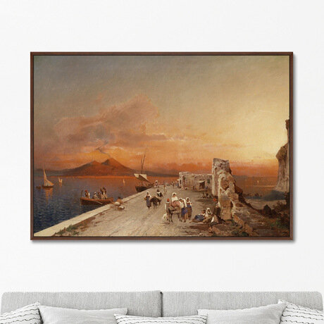 Хотите добавить в интерьер произведение, которое станет центром внимания и создаст особую атмосферу? Эта репродукция картины 1895 года переносит вас на средиземноморское побережье с золотистым закатом и величественным видом на вулкан. Холст размером 105×75 см идеально впишется в просторное помещение, добавив ему глубины и исторического контекста. Три главных преимущества: - Музейное качество печати — технология Epson SureColor SC-P8000 передает все нюансы оригинального полотна - Готовое решение — картина уже натянута на подрамник и обрамлена в деревянную раму цвета орех - Удобный монтаж — встроенная система подвеса позволяет установить картину за 5 минут Эта репродукция идеально подойдет для помещений от 15 кв. м. Благодаря теплым оранжевым и золотистым оттенкам картина особенно хорошо будет смотреться в гостиной, кабинете или столовой с нейтральными стенами. Работа прекрасно дополнит как современный интерьер, внося в него художественный акцент, так и классическую обстановку, подчеркивая ее изысканность. Натуральный холст — изготовлен из 100% хлопка, что обеспечивает фактуру, близкую к оригинальному произведению искусства Надежный подрамник — выполнен из деревянных брусьев, предотвращает деформацию холста с течением времени Рама из полистирола — выглядит как дорогая деревянная, но при этом легкая и прочная Уход за картиной минимален — достаточно изредка протирать поверхность сухой мягкой тканью от пыли. Рекомендуется размещать вдали от прямых солнечных лучей и источников повышенной влажности для сохранения яркости красок на долгие годы.